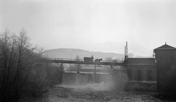 elv, foss, bro, Øvre Brekke bru, hest, vogn, fabrikkbygning