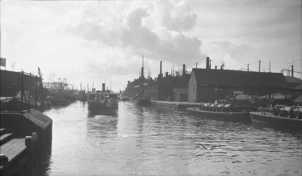 elv, utløp, havn, båter, badeferge til Hovedøya bad, søppelplammer til Langøyene, Nylands verksted, fabrikkbygninger