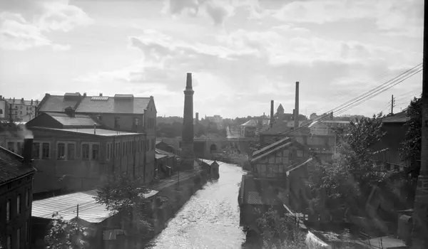 Utsikt sydover mot Sannerbrua, som skimtes midt i bildet - bak den kraftige fabrikkpipen. Til venstre ligger Foss bryggeri, bygget i 1898 på tomten hvor Øvre Foss teglverk lå. Bryggeriet ble revet i 1960-årene. I horisonten - mellom de to pipene i høyre bildehalvdel - ses tårnet på Gamle Aker kirke. Inger Munch, søster av Edvard Munch, testamenterte ved sin død i 1952 ca 200 negativer til Oslo Bymuseum. Blant dem negativene til de fleste bildene i hennes bok "Akerselven", utgitt i 1932.