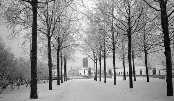 park, skulpturpark, bro, skulpturer, hus rundt Monolitten, snø