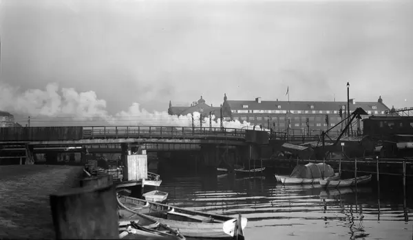 elv, robåter, jernbanebro, jernbanevogn, damp fra lokomotiv, Oslo tollsted