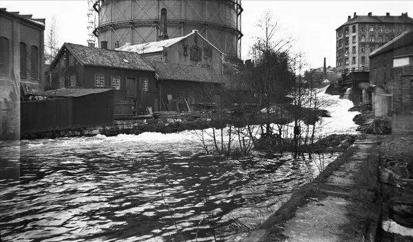 elv, fabrikkbygninger, gassbeholder, bygårder