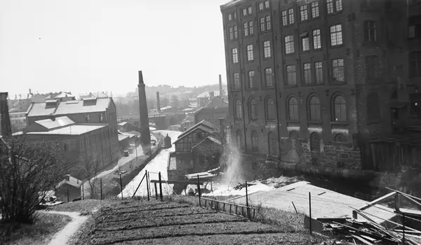 elv, Graahs spinneri, fabrikkbygninger, fabrikkpiper, bro