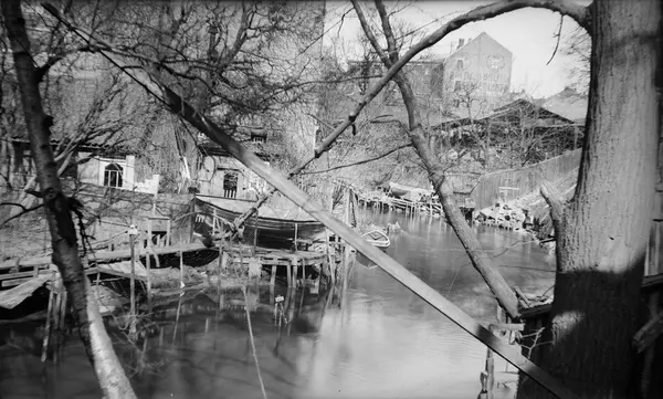 elv, båter, trehusbebyggelse, bygårder, uthus