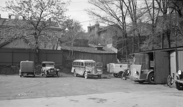 Osmond Motor A/S, gårdsplass, garasje, biler, buss, Underhaug løkke, bygårder, villabebyggelse