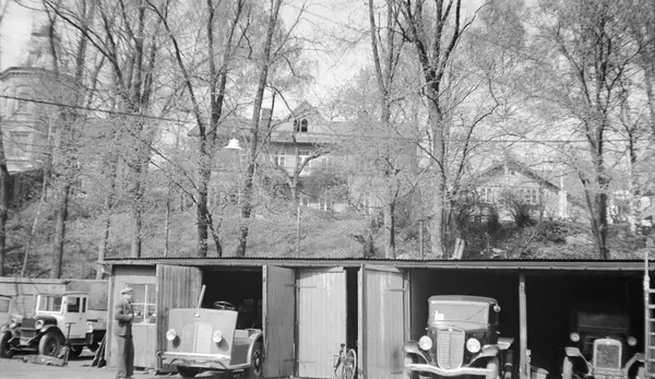 Osmond Motor A/S, gårdsplass, garasje, biler, buss, mann, villabebyggelse