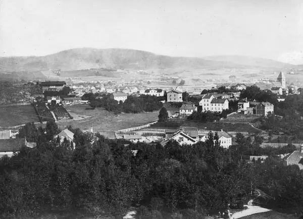 Utsikt fra Slottet. I bakgrunnen til venstre "Høien". I forgrunnen "Vendom, og rett til høyre for midten professor Brochs løkke, Dahlsløkken (tidligere Ullevålsveien 25, nå Hallings gate 5) og "Dalerhaugen".