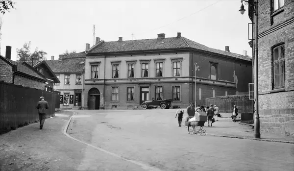 bygårder, trehus, kolonialforretning, bil, kvinne, barnevogn, barn