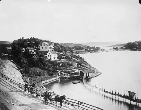 vei, hest, vogn, mennesker, jernbanelinje, fjord, fiskegarn, sjøhus, bolighus, hage, Ormsund bro