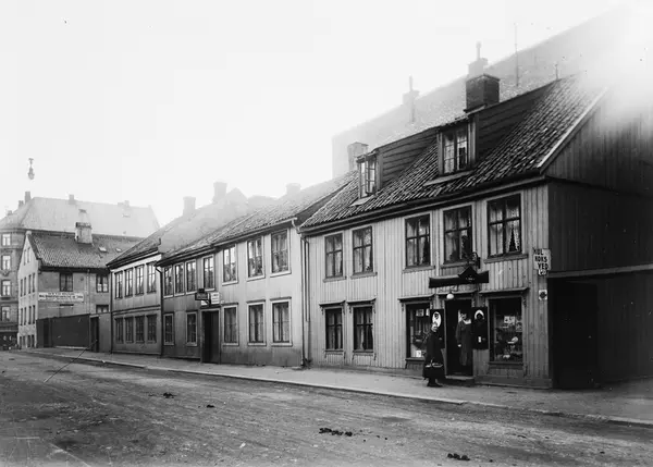 gateløp, trehusbebyggelse, forretning, kvinner, bygårder