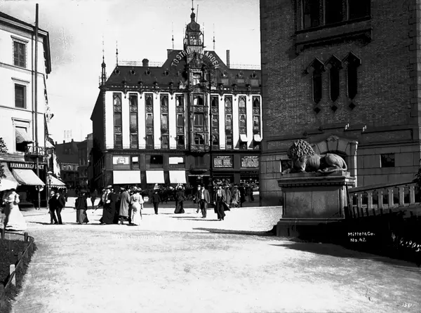 forretningsgårder, Stortingsbygningen, løveskulptur, mennesker, gateliv
