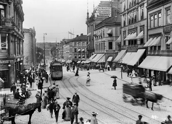 gateløp, forretningsgårder, markiser, hestekjøretøyer, trikker, mennesker, gateliv, Stortingsbygningen, Slottet