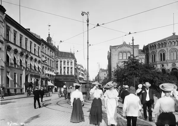 gateløp, Grand Hotel, Stortingsbygningen, forretningsgårder, hestekjøretøyer, mennesker, gateliv