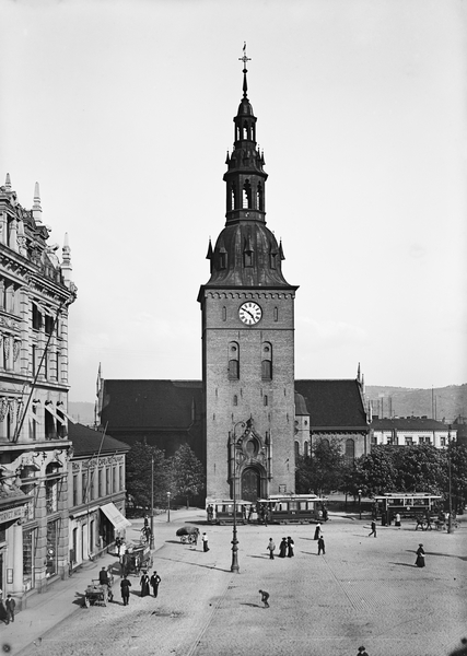 Vår Frelsers kirke, torg, trikker, hest, vogn, bryggerivogn, mennesker