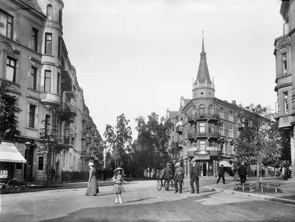 gateløp, gatekryss, bygårder, forhager, mennesker