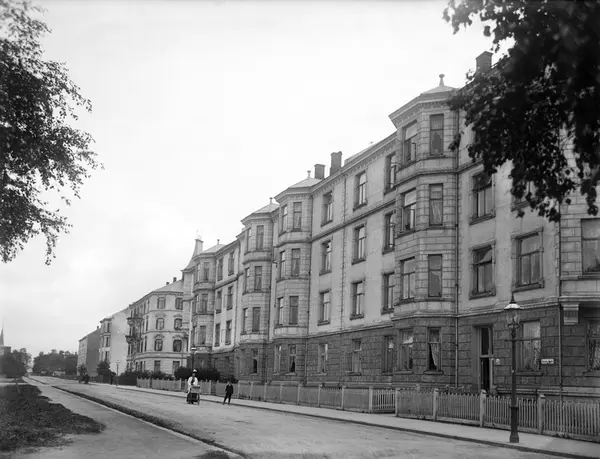 gateløp, bygårder, forhager, gjerder, kvinne, barnevogn, gutt