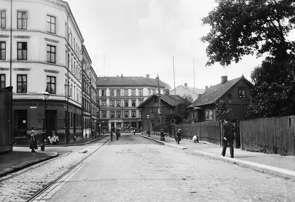 gateløp, bygårder, trehusbebyggelse, hager, forretninger, mennesker, gjerde
