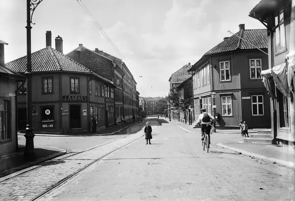 gateløp, bygårder, trehusbebyggelse, kolonialforretning, barn, syklist