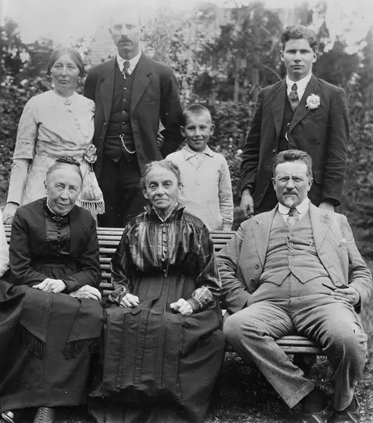 Foran: Thekla Resvolls tante Laura Deichmann, Hilda Stengel Holmsen, Andreas Holmsen Bak: Hanna Marie Resvoll Holmsen, Gunnar Holmsen, Per Holmsen, , Dag Resvoll Holmsen.