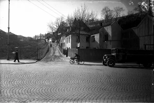 gateløp, trehusbebyggelse, lastebil, syklist, mennesker, brostein, parsellhager