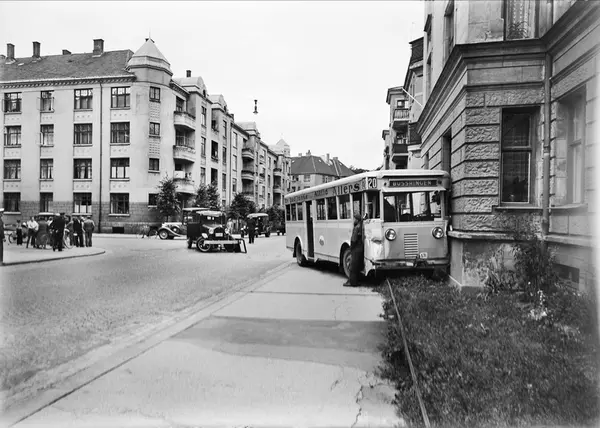 Bussen har kjørt inn i Magnus Bergs gate 6. Gårdene på venstre side av gaten er Gimleveien 24, Magnus Bergs gate 1 og Thomas Heftyes gate 43.