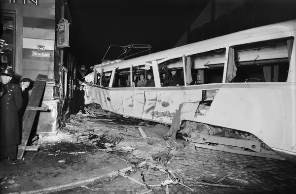 trikk, trafikkulykke, politikonstabel, tilskuere, bygård
