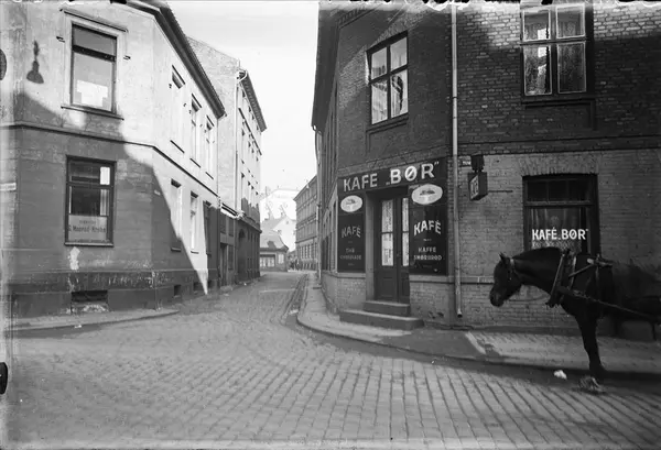 gateløp, bygårder, Kafé Bør, hest, brostein