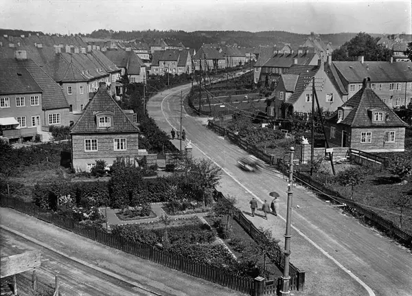 vei, fortau, mennesker, bil, bolighus, villaer, rekkehus, hager, gjerder
