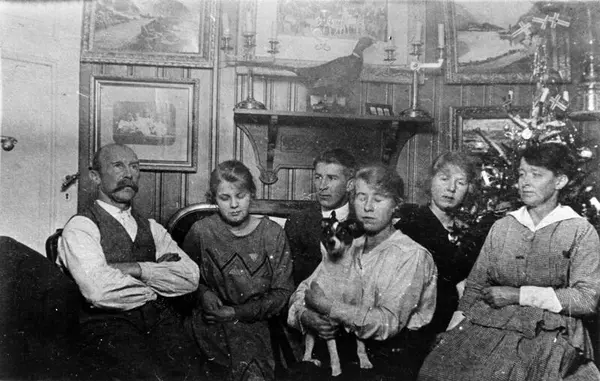 Ffra venstre fyrvokter Anton Nielsen, ukjent, Fridtjof Ustad (sønn), Astrid Kjærstad (datter), Ingeborg Kjærstad (datter), Anna Amalie Nielsen (hustru).