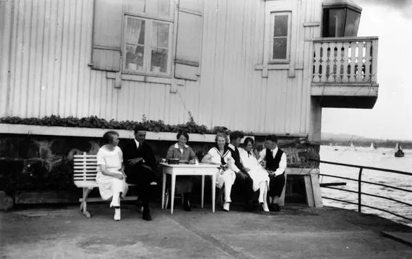 Fra venstre: Astrid Kjærstad (datter), Olaf Kjærstad (svigersønn), Anna Amalie (hustru), Ingeborg Kjærstad (datter), Fridtjof Ustad (sønn), Solveig Ustad (svigerdatter), Erling Ustad (sønn). Til høyre den gamle fyrlykten på Dyna fyr.