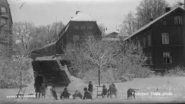 plass, trapp, trær, barn, lek, sparkstøttinger, snø, bygårder