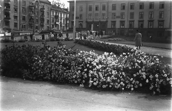 Majorstuen stasjon, blomsterbed, mennesker, bygårder