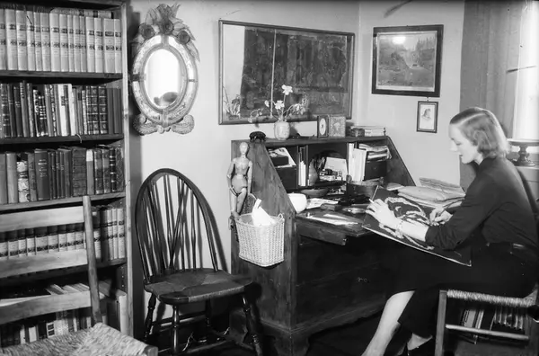 bolig, interiør, stue, bokhylle, skrivebord, kvinne, maling