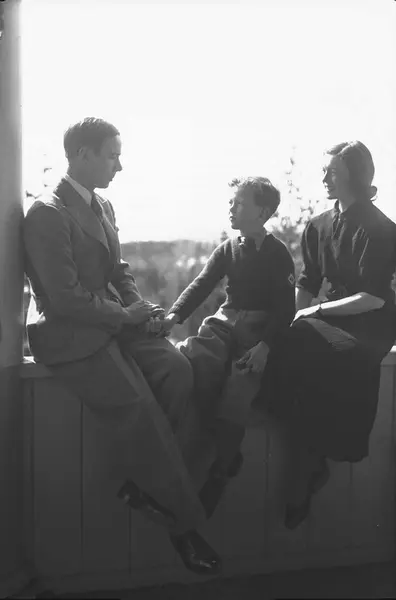 veranda, familiegruppe, kvinne, mann, gutt, skuespillere