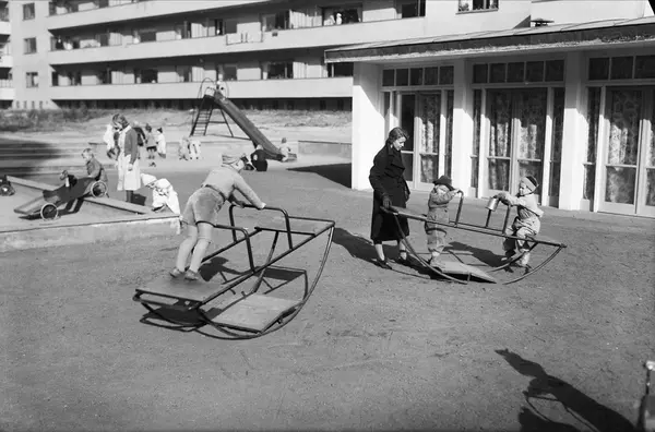barnehage, lekeplass, lekeapparater, barn, kvinner, boligblokk