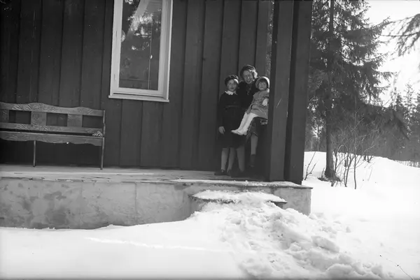 villa, terrasse, snø, kvinne, barn