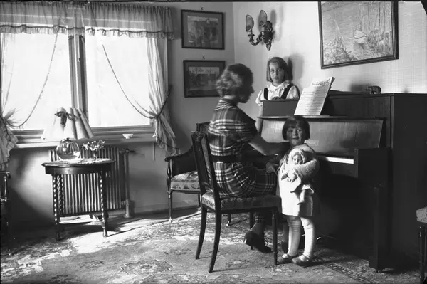 villa, interiør, stue, piano, pianospill, kvinne, jenter, dukke