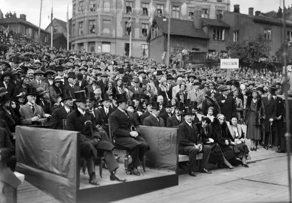 Rådhuset, grunnsteinsnedleggelse, publikum, konge, kronprins, bygård, trehusbebyggelse