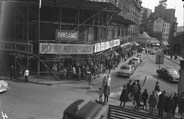 gateløp, forretningsgårder, Larsen & Lütken, inngangsparti, stillas, biler, mennesker, gateliv