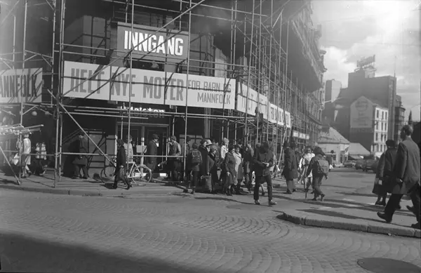 gateløp, forretningsgårder, Larsen & Lütken, inngangsparti, stillas, mennesker, gateliv