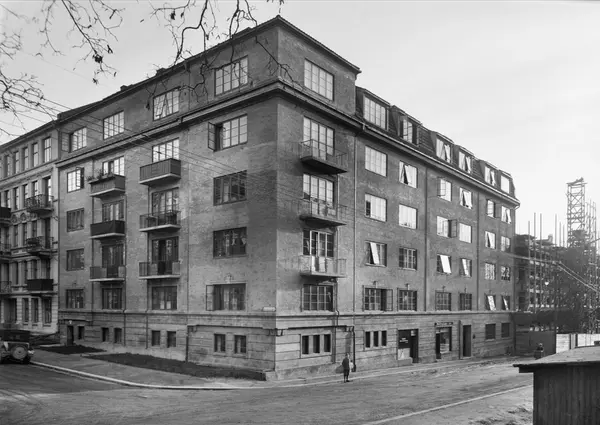 Nobels gate 23 (nærmest), stod ferdig i 1930. Nobels gate 21, under oppføring (nedenfor) stod ferdig i 1932. Bildet er dermed antagelig tatt i 1931.
