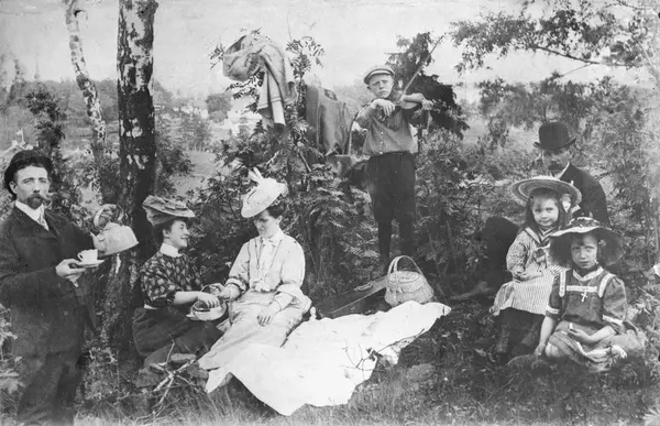 gruppe, landtur, menn, kaffeservering, kvinner, kakefat, jenter, gutt, fiolinspill