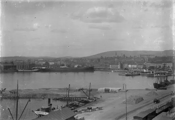 utsikt, havn, hester, vogner, dampskip, Akers mek. Verksted, Vestbanestasjonen, Victoria terrasse, bygårder, Slottet