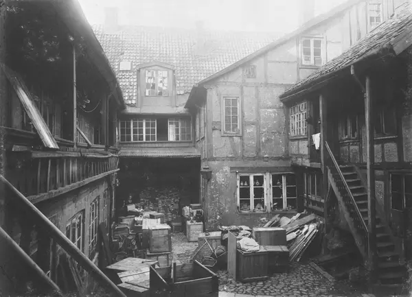 forretningsgård, Dopheides Magasin, gårdsinteriør, trapper, svalganger, bindingsverk, flyttelass