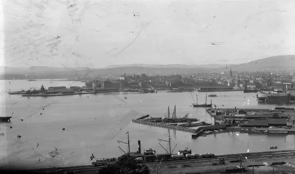 utsikt, havn, fjord, dampskip, seilfatyøyer, by, jernbane