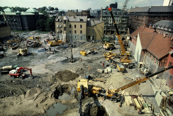 byggetomt for Norges Bank III, anleggsmaskiner, gravemaskiner, kraner, bygårder, kontorbygninger
