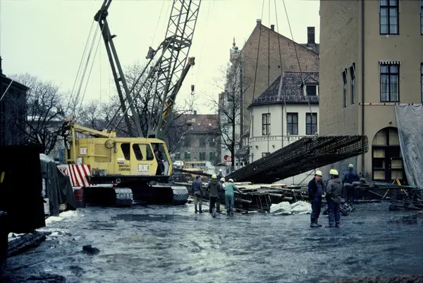 byggetomt for Norges Bank III, menn, anleggsarbeidere, anleggsmaskin, bygårder