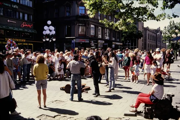 torg, mennesker, gatemusikanter, tilskuere, forretningsgårder, Stortingsbygningen