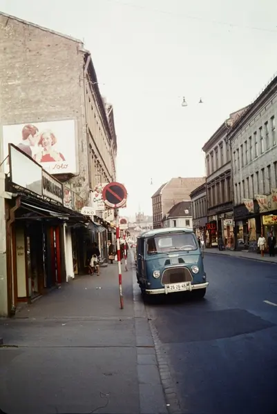 gateløp, forretningsgårder, bygårder, gavlvegg, reklameplakat, bil, mennesker