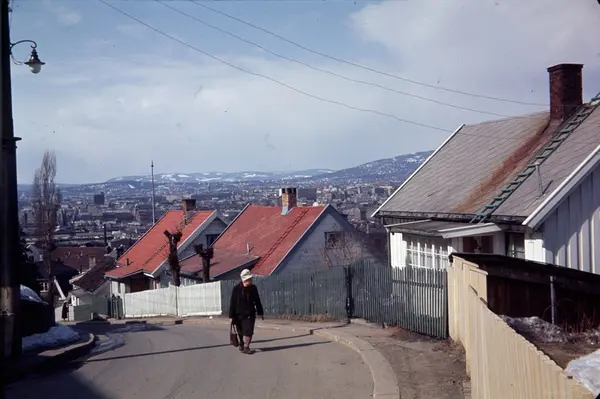 gateløp, trehusbebyggelse, kvinne, gjerde, utsikt, by